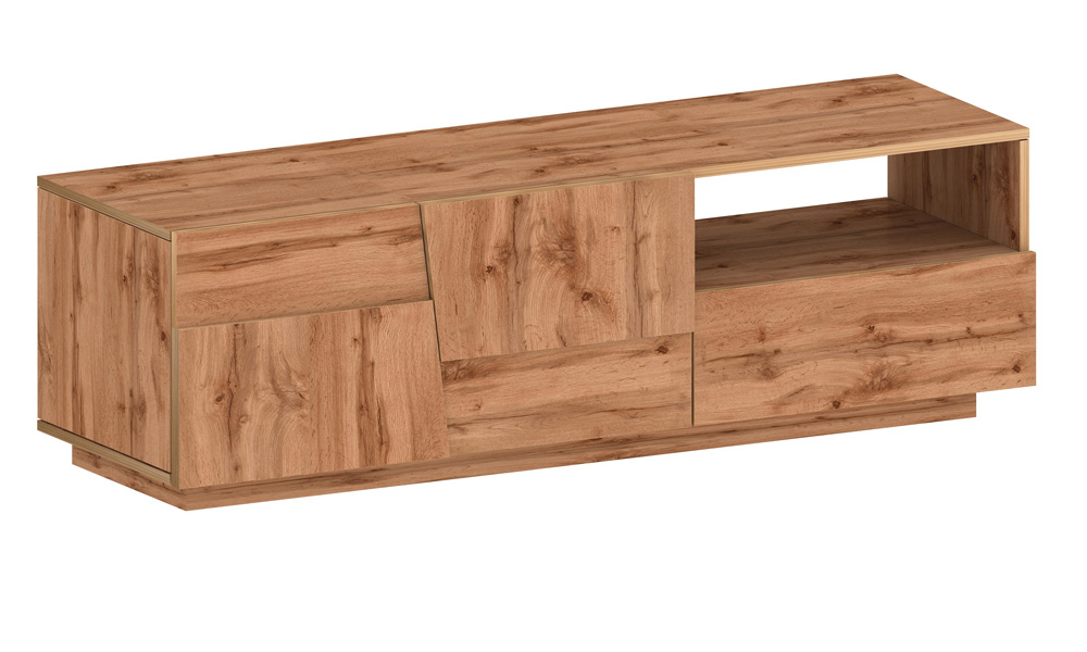 The PONGO 150 cm TV stand, with a depth of 44 cm and a height of 46 cm, has a sturdy structure with recycled wood materials, divided into two sections for better space organisation. On the left, there are 2 hinged doors with a diagonal cut and three-dimensional pattern on the fronts, forming a geometric relief with double depth, hiding a large single compartment suitable for storing various items.