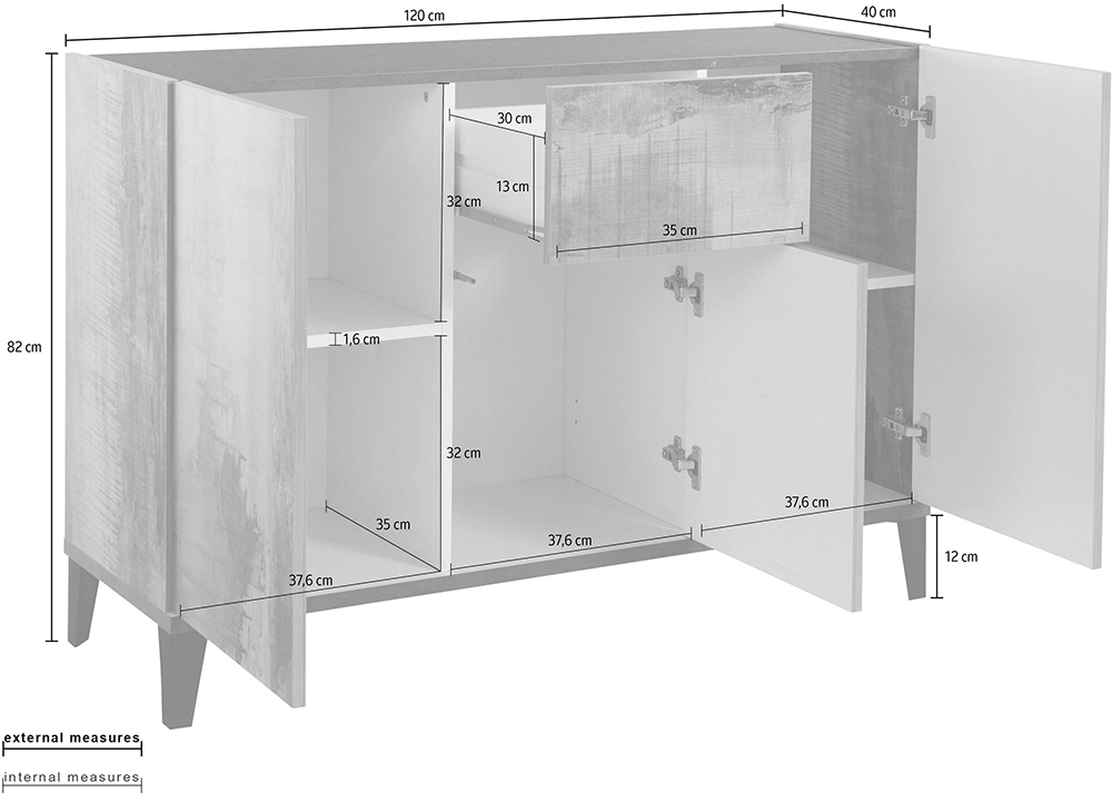 The sideboard is also supported by four 10 cm-high pyramid-shaped feet in black plastic. The linear shape makes it suitable for different interior design styles and the assembly kit includes simple, detailed instructions.